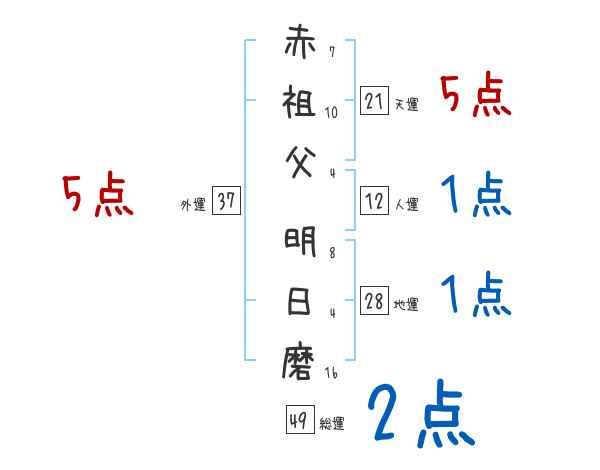 天運![]() | 赤祖父明日磨さんの天運は21画の5つ星!統率力がある。独立し成功する。名誉を手に入れる。 家系が持つ宿命的な運勢を表します。祖先から受け継いだ苗字ですので自分の力が及びません。家柄を象徴します。 |