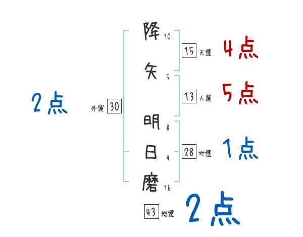 天運![]() | 降矢明日磨さんの天運は15画の4つ星!人徳があり出世する。順調に物事を進め円満な人生。 家系が持つ宿命的な運勢を表します。祖先から受け継いだ苗字ですので自分の力が及びません。家柄を象徴します。 |