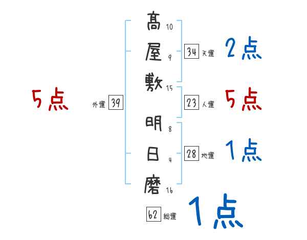 外運![]() | 髙屋敷明日磨さんの外運は39画の5つ星!社交性に優れ人望が厚い。人の上に立ち成功する。 生活面を象徴する運勢です。外部から受ける影響力を表し、結婚運、家庭運や職場、環境への順応性を表します。 |