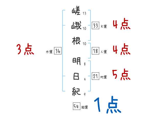 外運![]() | 嵯峨根明日紀さんの外運は36画の3つ星!先見性が豊かです。多少神経質で苦労することも。 生活面を象徴する運勢です。外部から受ける影響力を表し、結婚運、家庭運や職場、環境への順応性を表します。 |