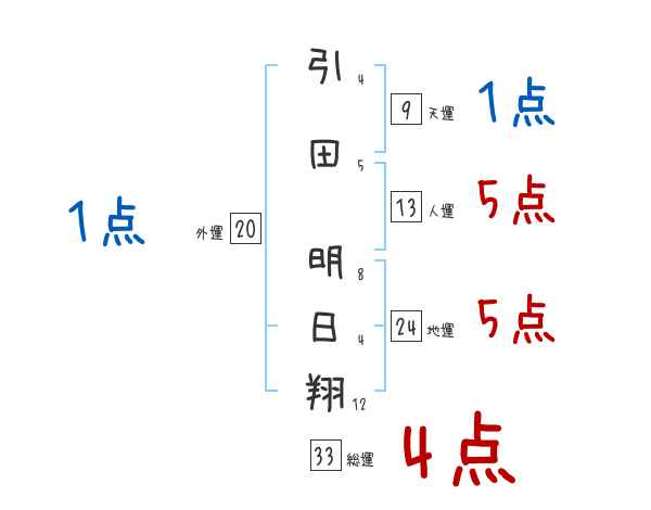 天運![]() | 引田明日翔さんの天運は9画の1つ星!消極的で才能を発揮することが苦手なことも。周りの意見に耳を傾けましょう。 家系が持つ宿命的な運勢を表します。祖先から受け継いだ苗字ですので自分の力が及びません。家柄を象徴します。 |