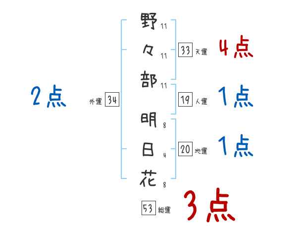 天運![]() | 野々部明日花さんの天運は33画の4つ星!権力志向でプライドが高い。勇気があり運を切り開き成功する。 家系が持つ宿命的な運勢を表します。祖先から受け継いだ苗字ですので自分の力が及びません。家柄を象徴します。 |