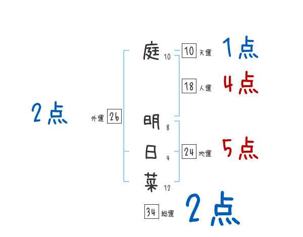 人運![]() | 庭明日菜さんの人運は18画の4つ星!情熱的で剛気。忍耐力があり信頼される。 性格や才能などを表す2番目に重要な運勢です。人間関係や協調性、社会的な成功に影響します。主に20歳から50歳ぐらいまでの中年期の運勢を表します。 |