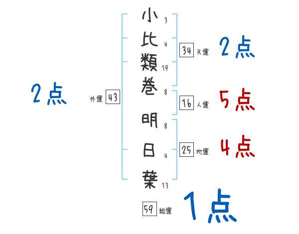 人運![]() | 小比類巻明日葉さんの人運は16画の5つ星!人望が厚く大きく発展する。逆転成功が見える。 性格や才能などを表す2番目に重要な運勢です。人間関係や協調性、社会的な成功に影響します。主に20歳から50歳ぐらいまでの中年期の運勢を表します。 |