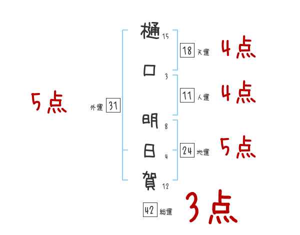 天運![]() | 樋口明日賀さんの天運は18画の4つ星!情熱的で剛気。忍耐力があり信頼される。 家系が持つ宿命的な運勢を表します。祖先から受け継いだ苗字ですので自分の力が及びません。家柄を象徴します。 |