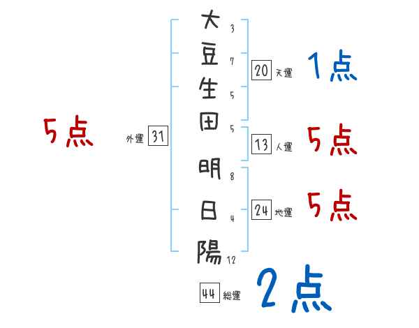 総運![]() | 大豆生田明日陽さんの総運は44画の2つ星!誠実で慎重な性格。物事を考えすぎないように注意しましょう。 あなたの人生を表す1番重要な運勢です。生涯を通じて影響する総合運となり、主に50歳以降の晩年期に影響を及ぼします。 |