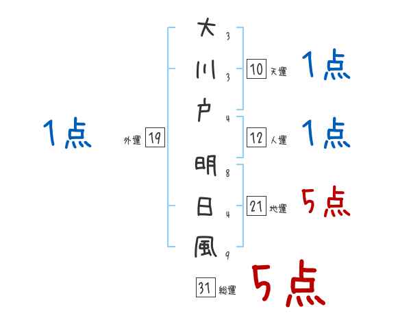 天運![]() | 大川戸明日風さんの天運は10画の1つ星!不安を感じやすい傾向。ストレスを抱えないように注意しましょう。 家系が持つ宿命的な運勢を表します。祖先から受け継いだ苗字ですので自分の力が及びません。家柄を象徴します。 |