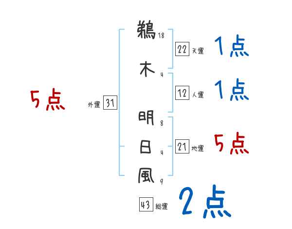 総運![]() | 鵜木明日風さんの総運は43画の2つ星!頑固な性格で独立心が強いかも。やや非現実的で浪費に注意しましょう。 あなたの人生を表す1番重要な運勢です。生涯を通じて影響する総合運となり、主に50歳以降の晩年期に影響を及ぼします。 |