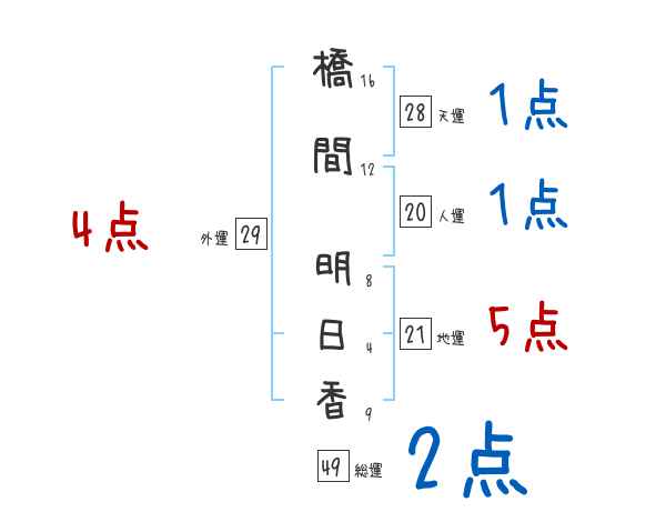 外運![]() | 橋間明日香さんの外運は29画の4つ星!完全主義で才能がある。厳格な心の持ち主。 生活面を象徴する運勢です。外部から受ける影響力を表し、結婚運、家庭運や職場、環境への順応性を表します。 |