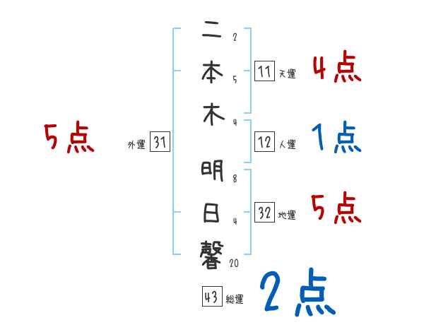 地運![]() | 二本木明日馨さんの地運は32画の5つ星!柔軟性があり成功する。チャンスが多く金運が良い。 個性を表す基礎的な運勢です。性格形成や対人関係、行動力など家庭環境に影響されます。主に誕生してから20歳くらいまでの若年期の運勢を表します。 |