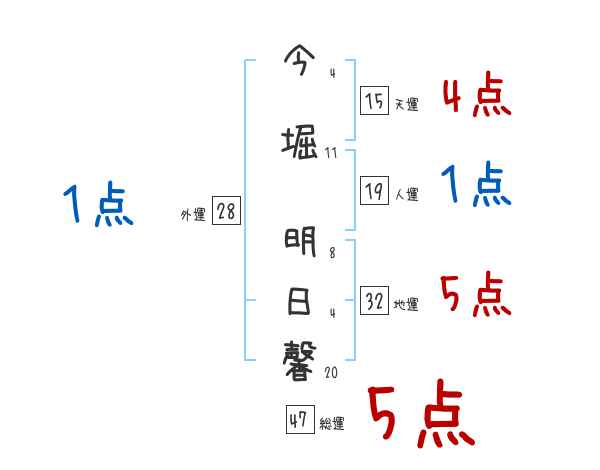 総運![]() | 今堀明日馨さんの総運は47画の5つ星!実力が開花し発展する円満な人生。財に恵まれる。 あなたの人生を表す1番重要な運勢です。生涯を通じて影響する総合運となり、主に50歳以降の晩年期に影響を及ぼします。 |