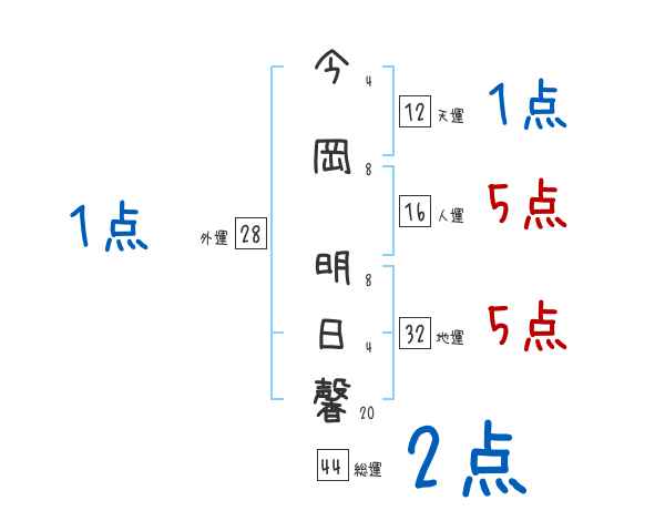 総運![]() | 今岡明日馨さんの総運は44画の2つ星!誠実で慎重な性格。物事を考えすぎないように注意しましょう。 あなたの人生を表す1番重要な運勢です。生涯を通じて影響する総合運となり、主に50歳以降の晩年期に影響を及ぼします。 |