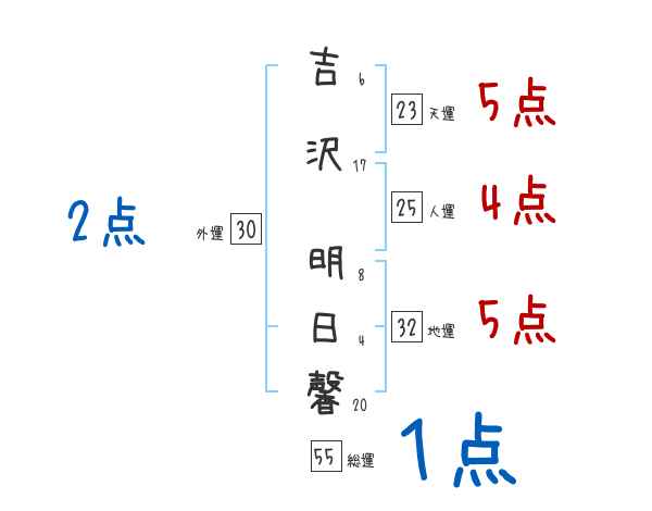 天運![]() | 吉沢明日馨さんの天運は23画の5つ星!想像力に優れ活力がある。一代で成功し名誉を手に入れる。 家系が持つ宿命的な運勢を表します。祖先から受け継いだ苗字ですので自分の力が及びません。家柄を象徴します。 |