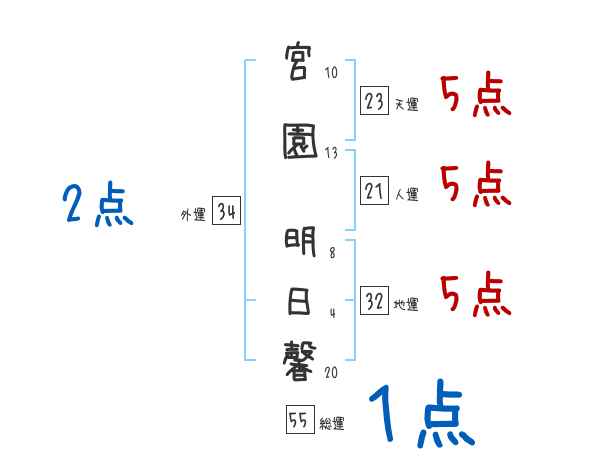 天運![]() | 宮園明日馨さんの天運は23画の5つ星!想像力に優れ活力がある。一代で成功し名誉を手に入れる。 家系が持つ宿命的な運勢を表します。祖先から受け継いだ苗字ですので自分の力が及びません。家柄を象徴します。 |
