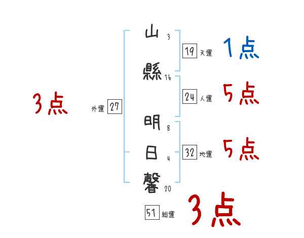 外運![]()  | 山縣明日馨さんの外運は27画の3つ星!頭脳明晰だが強情で摩擦が多い傾向。孤立に注意。 生活面を象徴する運勢です。外部から受ける影響力を表し、結婚運、家庭運や職場、環境への順応性を表します。 |