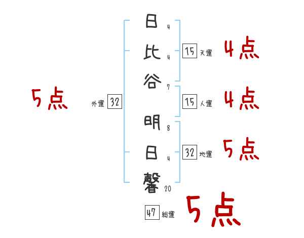 外運![]() | 日比谷明日馨さんの外運は32画の5つ星!柔軟性があり成功する。チャンスが多く金運が良い。 生活面を象徴する運勢です。外部から受ける影響力を表し、結婚運、家庭運や職場、環境への順応性を表します。 |