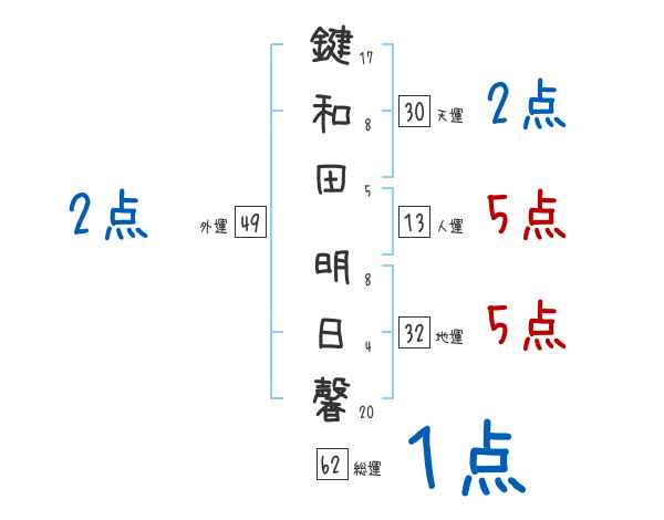 天運![]() | 鍵和田明日馨さんの天運は30画の2つ星!浮き沈みの激しさに注意しましょう。 家系が持つ宿命的な運勢を表します。祖先から受け継いだ苗字ですので自分の力が及びません。家柄を象徴します。 |
