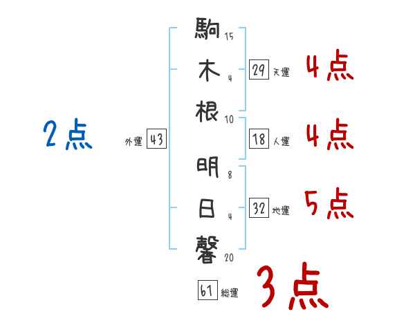 天運![]() | 駒木根明日馨さんの天運は29画の4つ星!完全主義で才能がある。厳格な心の持ち主。 家系が持つ宿命的な運勢を表します。祖先から受け継いだ苗字ですので自分の力が及びません。家柄を象徴します。 |