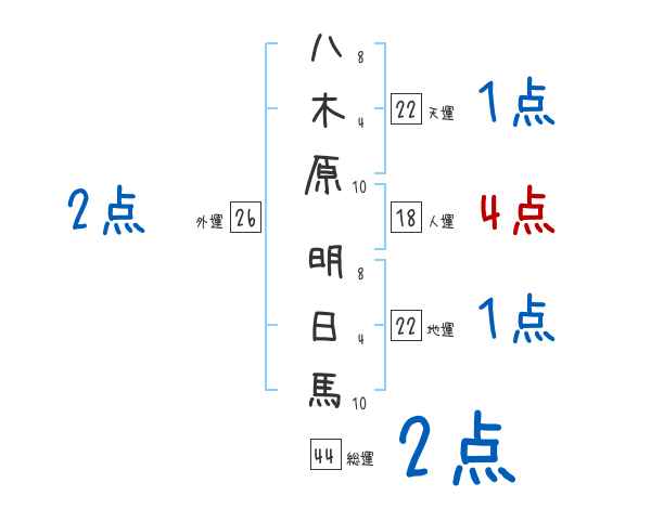 総運![]() | 八木原明日馬さんの総運は44画の2つ星!誠実で慎重な性格。物事を考えすぎないように注意しましょう。 あなたの人生を表す1番重要な運勢です。生涯を通じて影響する総合運となり、主に50歳以降の晩年期に影響を及ぼします。 |