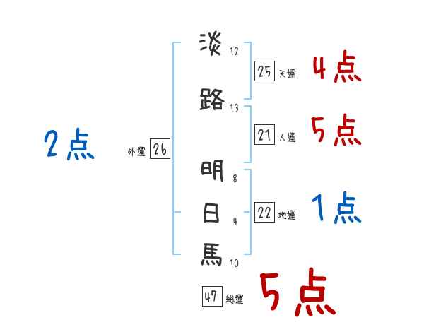 人運![]() | 淡路明日馬さんの人運は21画の5つ星!統率力がある。独立し成功する。名誉を手に入れる。 性格や才能などを表す2番目に重要な運勢です。人間関係や協調性、社会的な成功に影響します。主に20歳から50歳ぐらいまでの中年期の運勢を表します。 |
