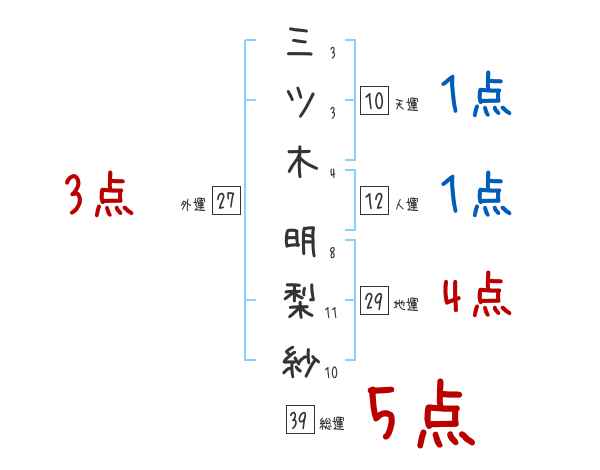 総運![]() | 三ツ木明梨紗さんの総運は39画の5つ星!社交性に優れ人望が厚い。人の上に立ち成功する。 あなたの人生を表す1番重要な運勢です。生涯を通じて影響する総合運となり、主に50歳以降の晩年期に影響を及ぼします。 |