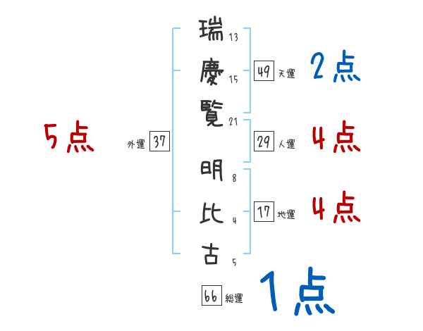 天運![]() | 瑞慶覧明比古さんの天運は49画の2つ星!不安定な性格で明暗がある人生。周りの人には支援されやすい。 家系が持つ宿命的な運勢を表します。祖先から受け継いだ苗字ですので自分の力が及びません。家柄を象徴します。 |