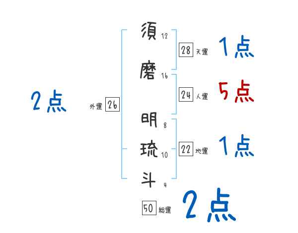 外運![]() | 須磨明琉斗さんの外運は26画の2つ星!波瀾万丈かも。信頼できる人を大事にしましょう。 生活面を象徴する運勢です。外部から受ける影響力を表し、結婚運、家庭運や職場、環境への順応性を表します。 |