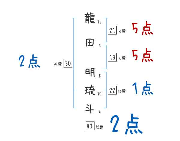 天運![]() | 龍田明琉斗さんの天運は21画の5つ星!統率力がある。独立し成功する。名誉を手に入れる。 家系が持つ宿命的な運勢を表します。祖先から受け継いだ苗字ですので自分の力が及びません。家柄を象徴します。 |