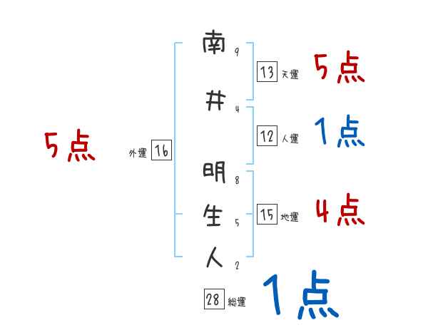 総運![]() | 南井明生人さんの総運は28画の1つ星!家庭環境に注意。スポーツで活躍できる能力があるかも。 あなたの人生を表す1番重要な運勢です。生涯を通じて影響する総合運となり、主に50歳以降の晩年期に影響を及ぼします。 |
