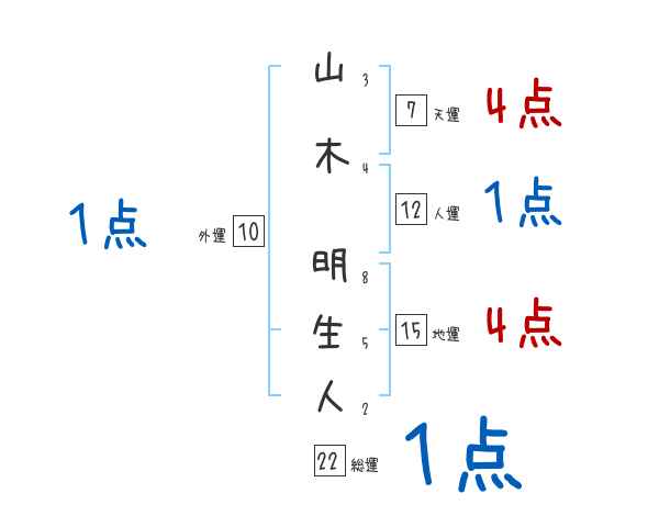 | 総運  | 山木明生人さんの総運は22画の1つ星!努力することが苦手ないっぽう手先が器用。芸術性にも優れる。あなたの人生を表す1番重要な運勢です。生涯を通じて影響する総合運となり、主に50歳以降の晩年期に影響を及ぼします。 |