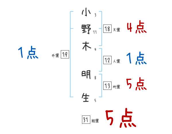 天運![]() | 小野木明生さんの天運は18画の4つ星!情熱的で剛気。忍耐力があり信頼される。 家系が持つ宿命的な運勢を表します。祖先から受け継いだ苗字ですので自分の力が及びません。家柄を象徴します。 |