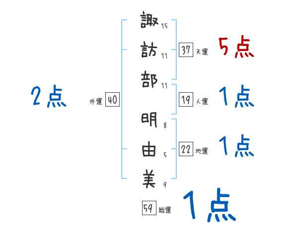 総運![]() | 諏訪部明由美さんの総運は59画の1つ星!意志の弱さであきらめることが多いかも。粘り強さが必要。 あなたの人生を表す1番重要な運勢です。生涯を通じて影響する総合運となり、主に50歳以降の晩年期に影響を及ぼします。 |