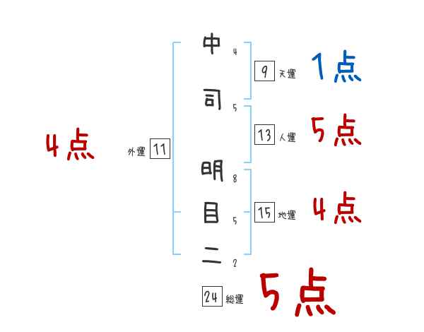 | 地運  | 中司明目二さんの地運は15画の4つ星!人徳があり出世する。順調に物事を進め円満な人生。個性を表す基礎的な運勢です。性格形成や対人関係、行動力など家庭環境に影響されます。主に誕生してから20歳くらいまでの若年期の運勢を表します。 |