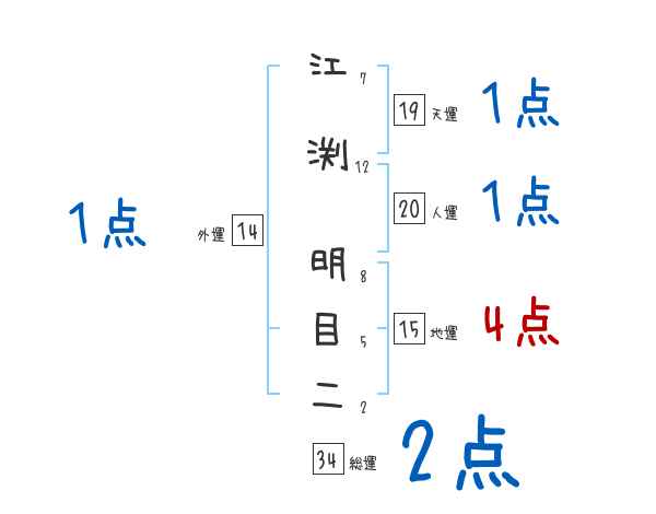 総運![]() | 江渕明目二さんの総運は34画の2つ星!独創性に優れるが、自尊心が強く災難に注意しましょう。 あなたの人生を表す1番重要な運勢です。生涯を通じて影響する総合運となり、主に50歳以降の晩年期に影響を及ぼします。 |