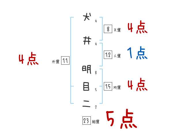 総運![]() | 犬井明目二さんの総運は23画の5つ星!想像力に優れ活力がある。一代で成功し名誉を手に入れる。 あなたの人生を表す1番重要な運勢です。生涯を通じて影響する総合運となり、主に50歳以降の晩年期に影響を及ぼします。 |