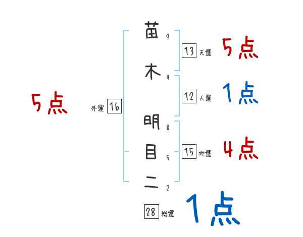 外運![]() | 苗木明目二さんの外運は16画の5つ星!人望が厚く大きく発展する。逆転成功が見える。 生活面を象徴する運勢です。外部から受ける影響力を表し、結婚運、家庭運や職場、環境への順応性を表します。 |