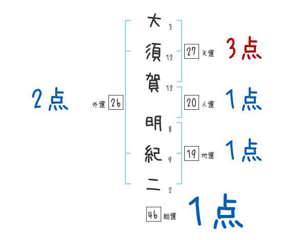 外運![]() | 大須賀明紀二さんの外運は26画の2つ星!波瀾万丈かも。信頼できる人を大事にしましょう。 生活面を象徴する運勢です。外部から受ける影響力を表し、結婚運、家庭運や職場、環境への順応性を表します。 |