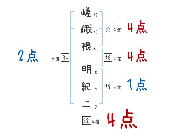 天運![]() | 嵯峨根明紀二さんの天運は33画の4つ星!権力志向でプライドが高い。勇気があり運を切り開き成功する。 家系が持つ宿命的な運勢を表します。祖先から受け継いだ苗字ですので自分の力が及びません。家柄を象徴します。 |