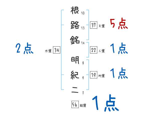 根路銘明紀二さんの画数の鑑定結果