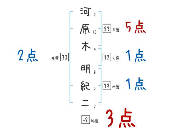 総運![]() | 河原木明紀二さんの総運は42画の3つ星!病気に注意。多芸であるが消極的でおとなしい。 あなたの人生を表す1番重要な運勢です。生涯を通じて影響する総合運となり、主に50歳以降の晩年期に影響を及ぼします。 |