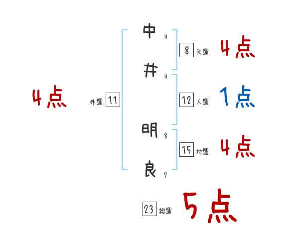 天運![]() | 中井明良さんの天運は8画の4つ星!勤勉家。根気強く努力し成功する。忍耐力がある。 家系が持つ宿命的な運勢を表します。祖先から受け継いだ苗字ですので自分の力が及びません。家柄を象徴します。 |