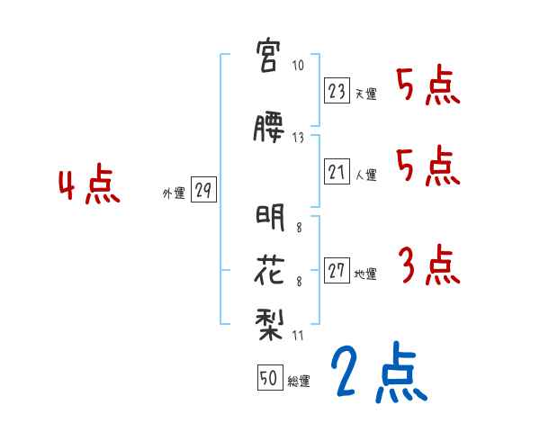 天運![]() | 宮腰明花梨さんの天運は23画の5つ星!想像力に優れ活力がある。一代で成功し名誉を手に入れる。 家系が持つ宿命的な運勢を表します。祖先から受け継いだ苗字ですので自分の力が及びません。家柄を象徴します。 |
