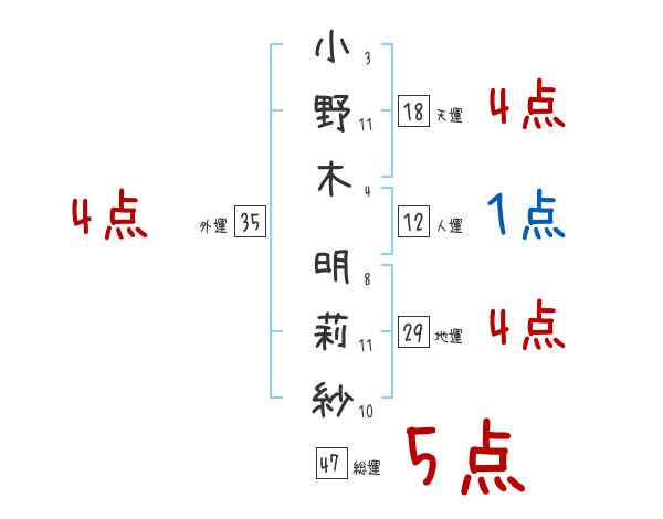外運![]() | 小野木明莉紗さんの外運は35画の4つ星!温厚な性格で感受性が高い。穏和な性格で人望が厚い。 生活面を象徴する運勢です。外部から受ける影響力を表し、結婚運、家庭運や職場、環境への順応性を表します。 |