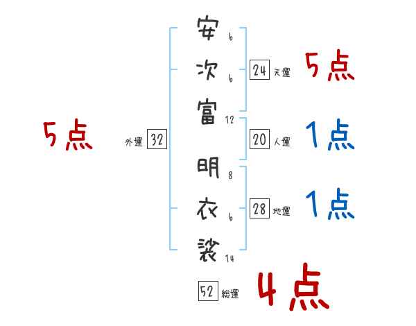 外運![]() | 安次富明衣裟さんの外運は32画の5つ星!柔軟性があり成功する。チャンスが多く金運が良い。 生活面を象徴する運勢です。外部から受ける影響力を表し、結婚運、家庭運や職場、環境への順応性を表します。 |