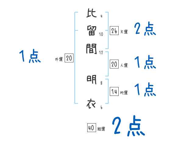 天運![]() | 比留間明衣さんの天運は26画の2つ星!波瀾万丈かも。信頼できる人を大事にしましょう。 家系が持つ宿命的な運勢を表します。祖先から受け継いだ苗字ですので自分の力が及びません。家柄を象徴します。 |