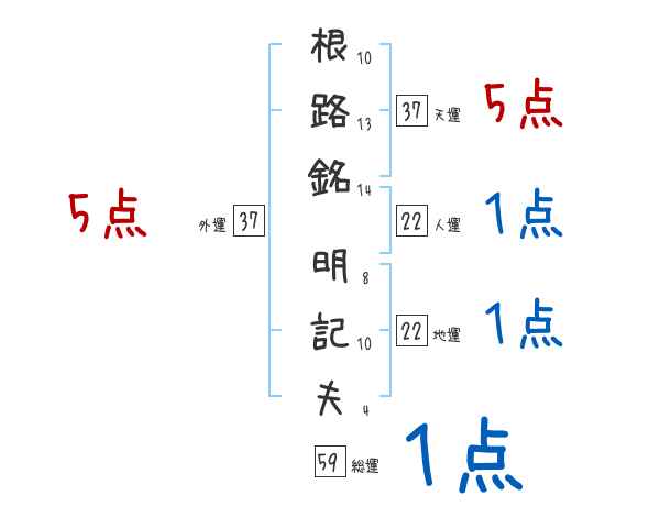 外運![]() | 根路銘明記夫さんの外運は37画の5つ星!努力家で順応性に優れる。現実的な考え方ができ忠実に物事をこなす。 生活面を象徴する運勢です。外部から受ける影響力を表し、結婚運、家庭運や職場、環境への順応性を表します。 |