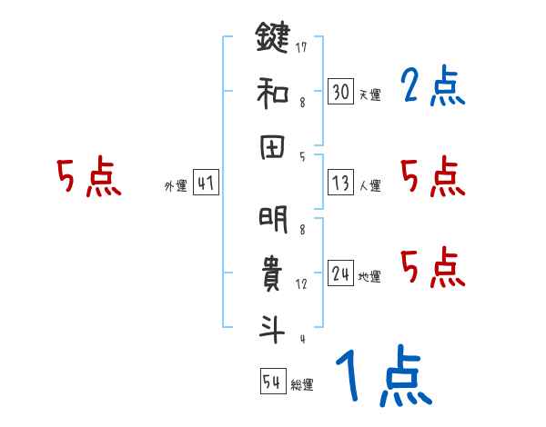 人運![]() | 鍵和田明貴斗さんの人運は13画の5つ星!才能に恵まれ人気がある。名声を手に入れる。円満な人生。 性格や才能などを表す2番目に重要な運勢です。人間関係や協調性、社会的な成功に影響します。主に20歳から50歳ぐらいまでの中年期の運勢を表します。 |