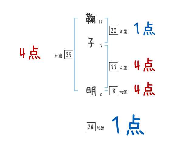総運![]() | 鞠子明さんの総運は28画の1つ星!家庭環境に注意。スポーツで活躍できる能力があるかも。 あなたの人生を表す1番重要な運勢です。生涯を通じて影響する総合運となり、主に50歳以降の晩年期に影響を及ぼします。 |