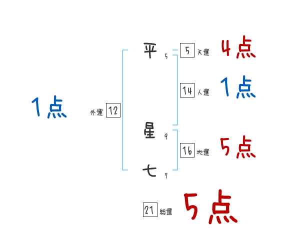 天運![]() | 平星七さんの天運は5画の4つ星!健康で安泰。協調性に優れ、財産に恵まれる。 家系が持つ宿命的な運勢を表します。祖先から受け継いだ苗字ですので自分の力が及びません。家柄を象徴します。 |