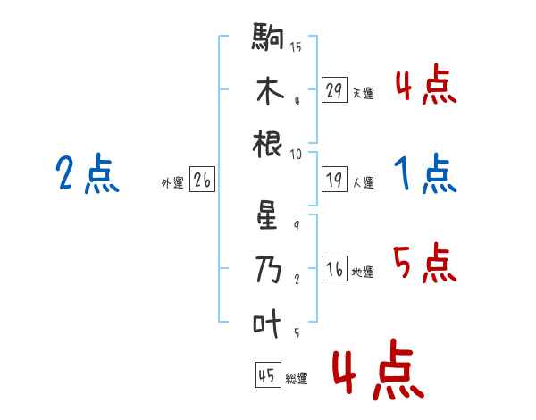 天運![]() | 駒木根星乃叶さんの天運は29画の4つ星!完全主義で才能がある。厳格な心の持ち主。 家系が持つ宿命的な運勢を表します。祖先から受け継いだ苗字ですので自分の力が及びません。家柄を象徴します。 |